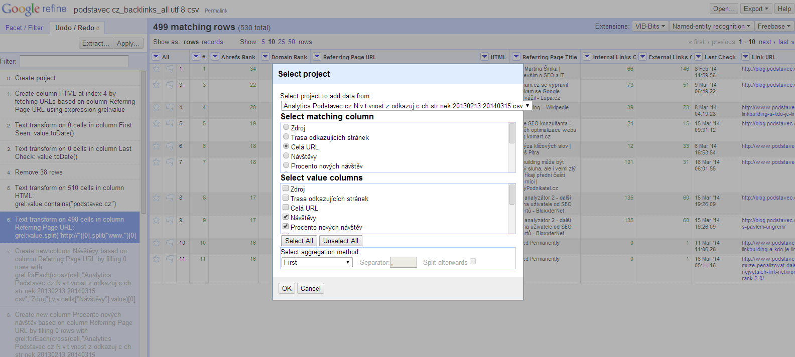 Předtím, než ale budeme data párovat, je třeba je dostat na stejná znění. Tedy aby ideálně všechny URL byly bez http://www (jinak by se nenapárovali například odkazy www.podstavec.cz a podstavec.cz, což jsou stejné zdroje). Vraťme se tedy do prvního projektu, kam chceme data dostat a osekejme jednotlivé URL na holou verzi.