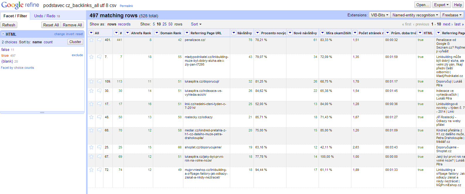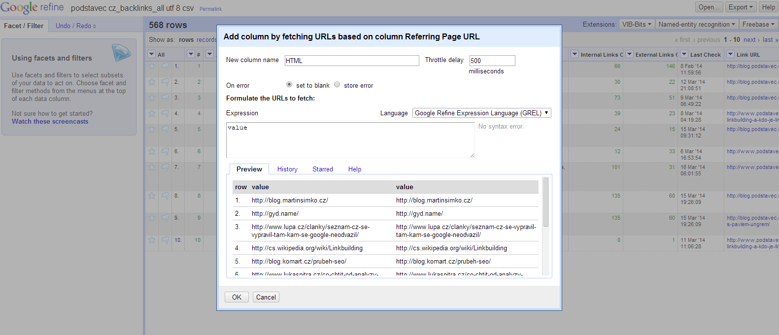 if(value.contains("vaseDomena.tld"), true, false)Tím se OpenRefine podívá do zdrojového kódu a zjistí, zda někde v obsahu nalezne řetězec „VaseDomena.tld“ a pokud ano, vepíše do daného sloupce true, jako že nalezl nebo false, jako že nenalezl. Někdo by mohl namítat, že to není ověření jisté, jelikož nekontroluje, zda je vaše doména v URL a zda není odkaz nofollow. Máte pravdu, osobně ale většinou řeším spíše zmínky než tvar odkazu a spíše efektivitu než jeho umístění.