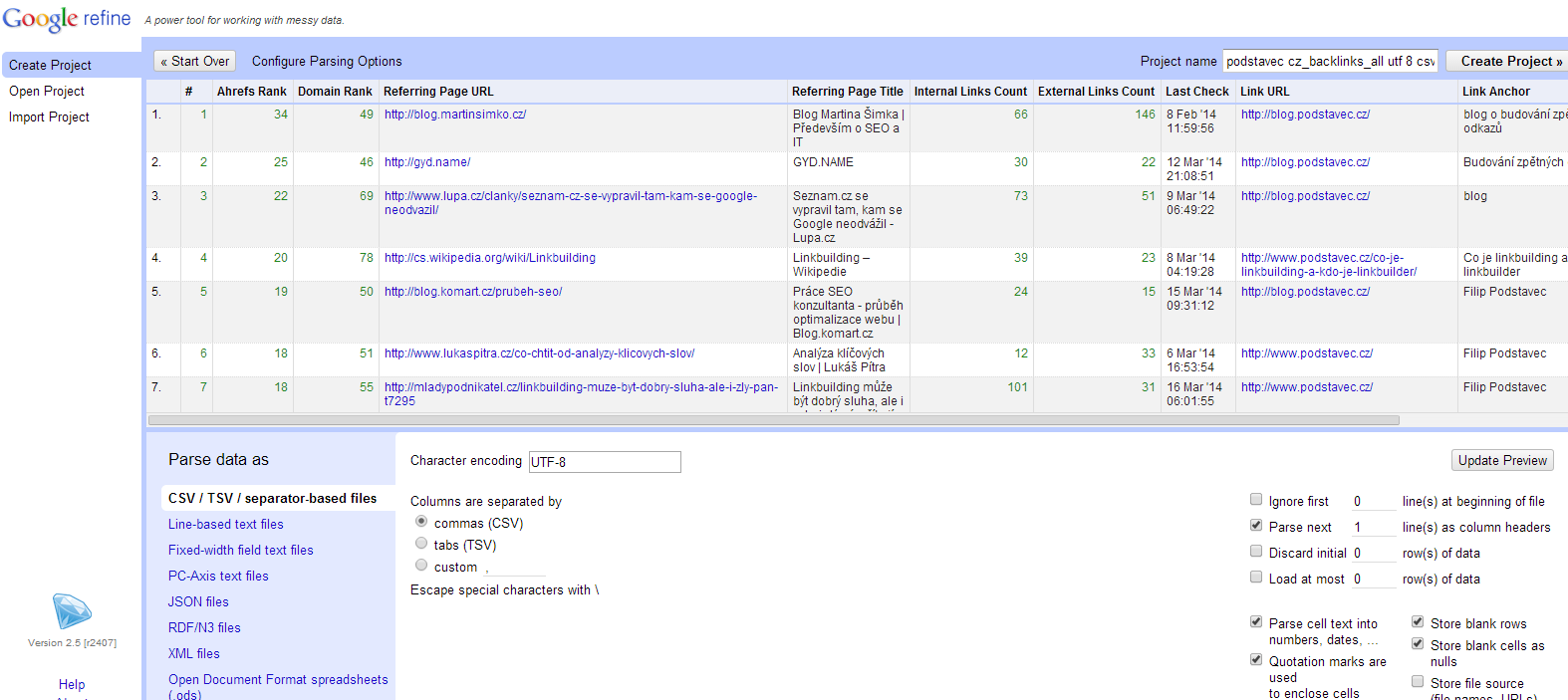 Nejprve je třeba získat někde data o odkazovém profilu. V tomto příkladu jsem si stáhl data o doméně Podstavec.cz z nástroje na analýzu odkazových profilů Ahrefs. Je čistě na vás, odkud základní dataset stáhnete (MajesticSEO,Webmaster tools, Collabim…), ale měl by obsahovat záznamy o zpětných odkazech a ideálně i jejich konkrétní umístění(URL).